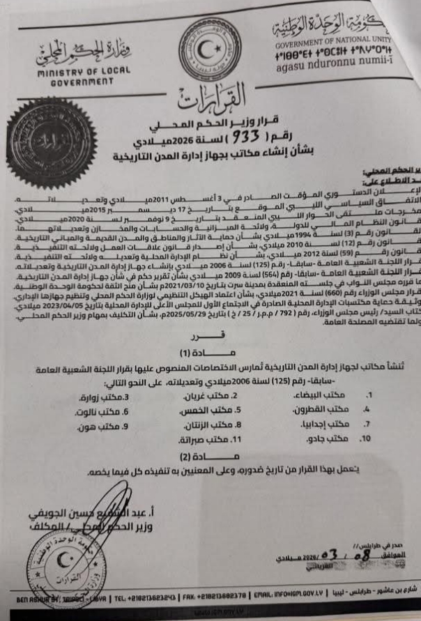 أعلنت وزارة الحكم المحلي في ليبيا اعتماد إنشاء 11 مكتبًا لإدارة المدن التاريخية في ليبيا، في خطوة تهدف إلى تعزيز حماية هذه المدن وتنظيم إدارتها بما يضمن الحفاظ على طابعها العمراني والثقافي.