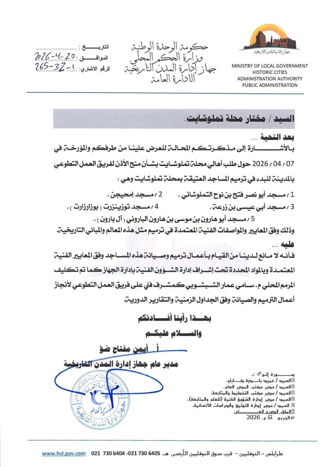 أعلن جهاز إدارة المدن التاريخية، التابع لوزارة الحكم المحلي بحكومة الوحدة الوطنية، منحه الإذن للشروع في تنفيذ أعمال ترميم مساجد محلة تملوشايت، وذلك استجابةً لطلب مقدم من أهالي المنطقة عبر مختار المحلة.