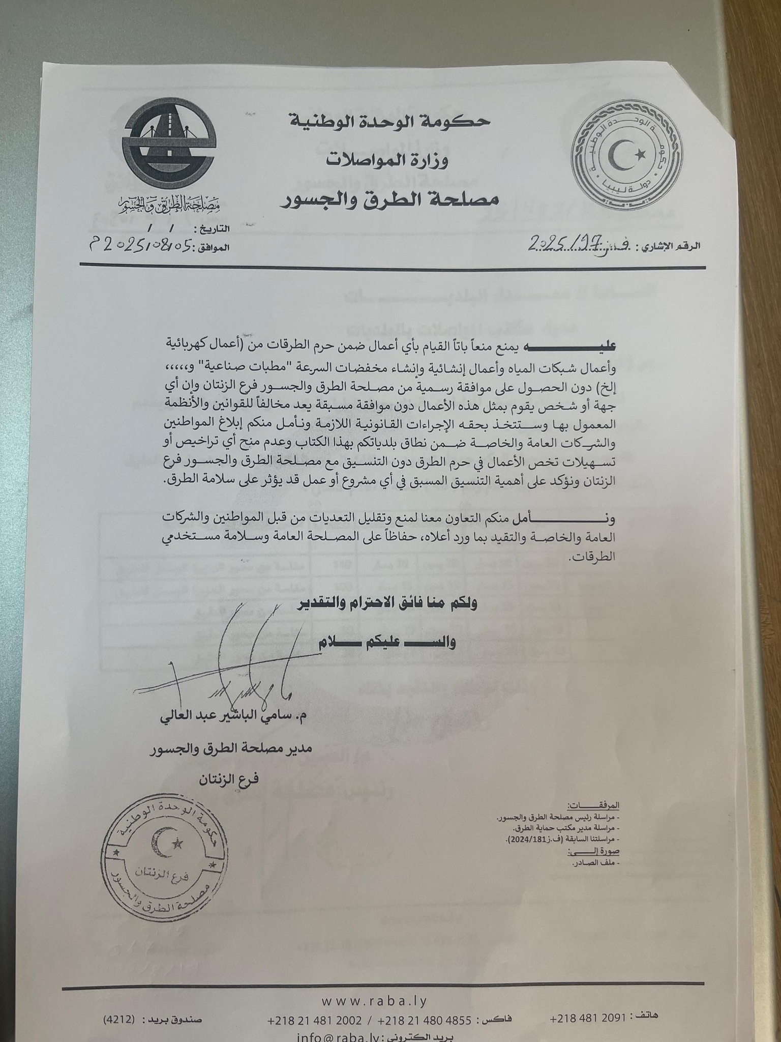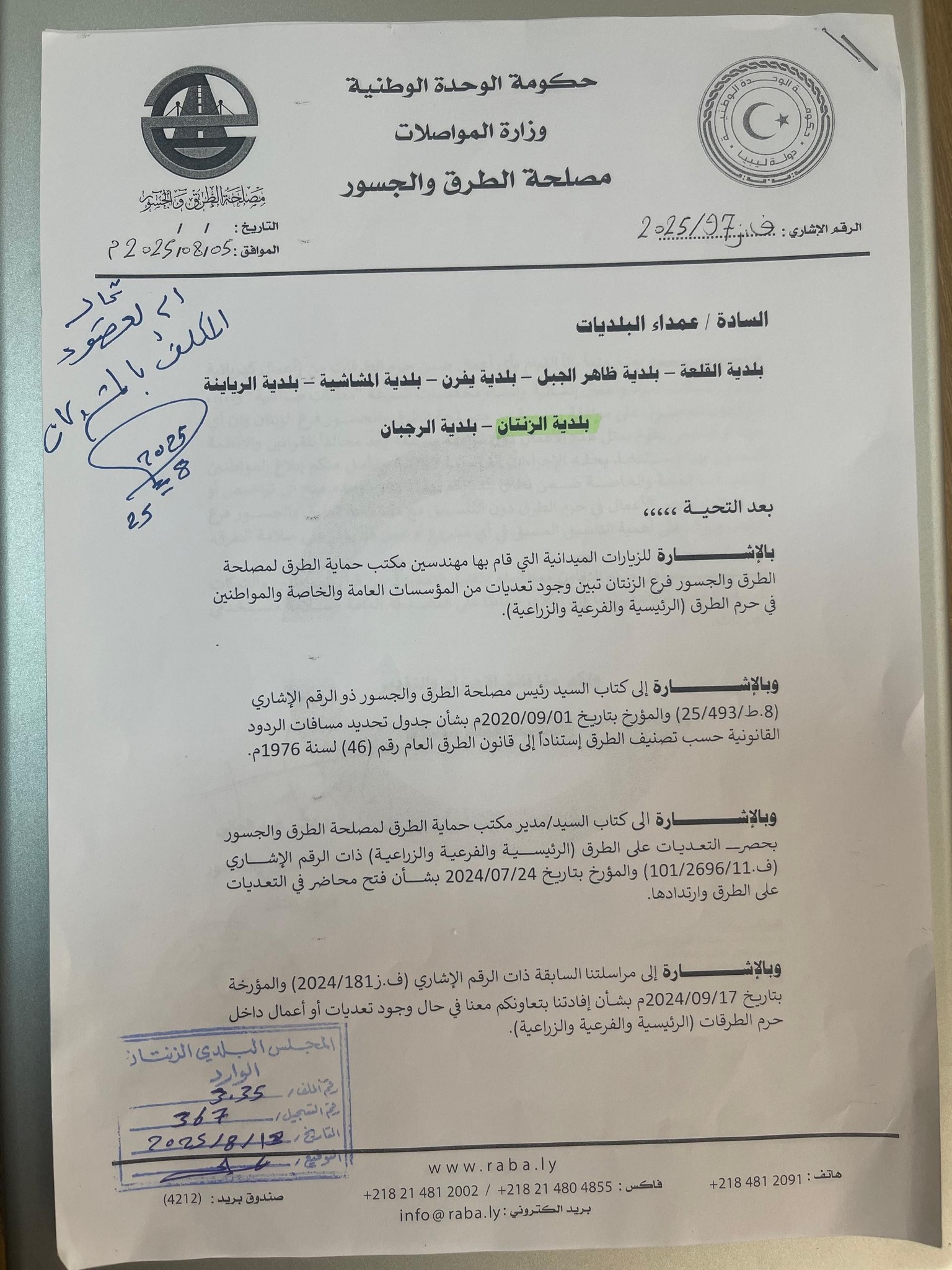 وحث المجلس البلدي الزنتان أصحاب الأراضي والعقارات الواقعة ضمن مسار المشروع على التعاون مع الجهات المختصة، مع مراعاة ارتدادات الطريق وفق القوانين واللوائح المعمول بها، والالتزام بإخلاء حرم الطريق وإزالة أي عوائق أو تعديات قد تعيق تقدم الأعمال، بما يحقق المصلحة العامة ويسهم في إنجاز المشروع بسرعة وكفاءة.